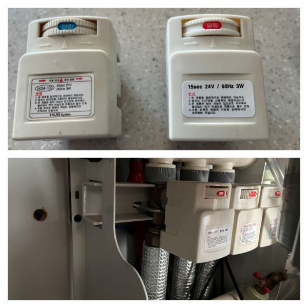 1. 현장 진단: 싱크대 하부의 분배기를 확인해 보니, 작은 방을 담당하는 **’구동기’**가 온도조절기의 신호를 받고도 작동하지 않았습니다. 밸브를 열어주지 못하니 난방수가 흐르지 못해 방이 차가웠던 것이죠.