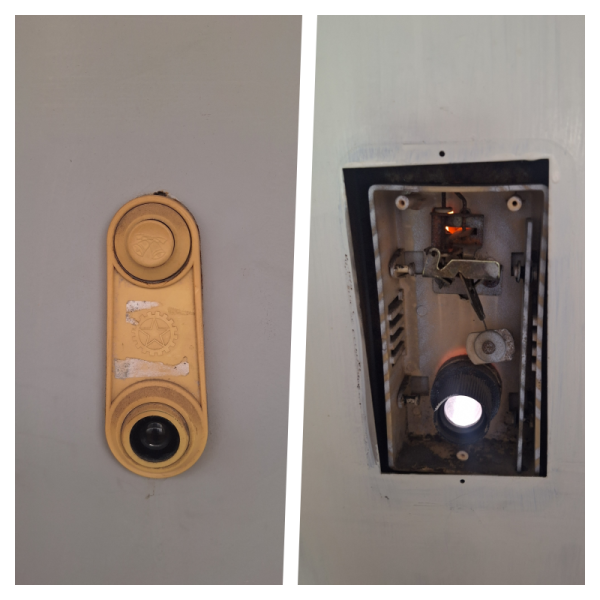 현장에 도착해 확인한 기존 차임벨은 전형적인 구형 모델이었습니다. 플라스틱 재질이 오랜 시간 햇빛과 공기에 노출되면서 본래의 색을 잃고 진한 노란색으로 변해 있었고, 누르는 버튼 부분은 플라스틱이 삭아 깨져 있는 상태였습니다.