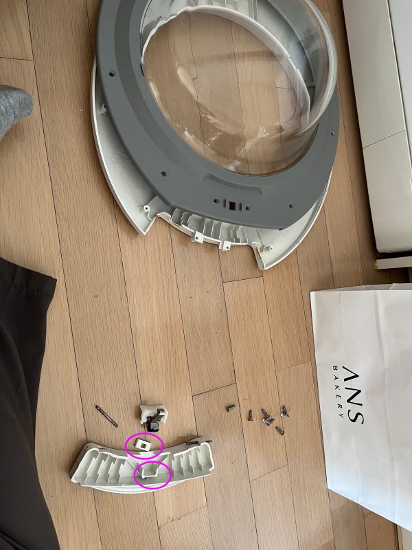 방문한 현장의 삼성 드럼세탁기는 손잡이 안쪽 플라스틱 걸쇠가 부러진 상태였습니다.