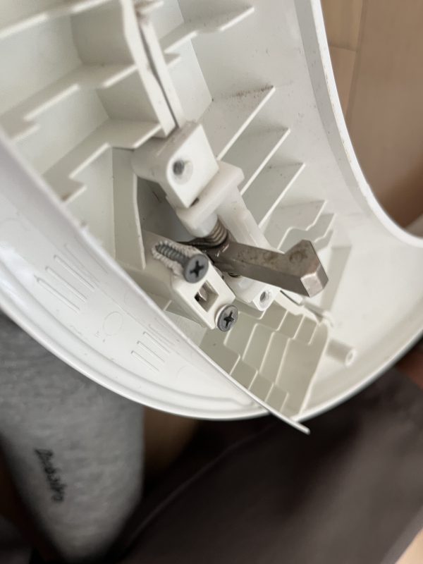내부를 확인해 보니 역시나 손잡이와 연결된 스프링 지지대 부분이 부러져 있었습니다. 오랜 사용으로 인한 플라스틱 피로 누적이 원인이었습니다.