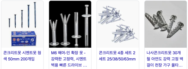 - 콘크리트용 못: 일반 못과 달리 강철로 만들어져 단단하고 잘 휘어지지 않습니다. 못의 표면에 홈이 파여 있어 콘크리트 속에서 단단히 고정되는 역할을 합니다. 길이나 굵기에 따라 종류가 다양하므로, 걸고자 하는 물건의 무게를 고려하여 선택해야 합니다.